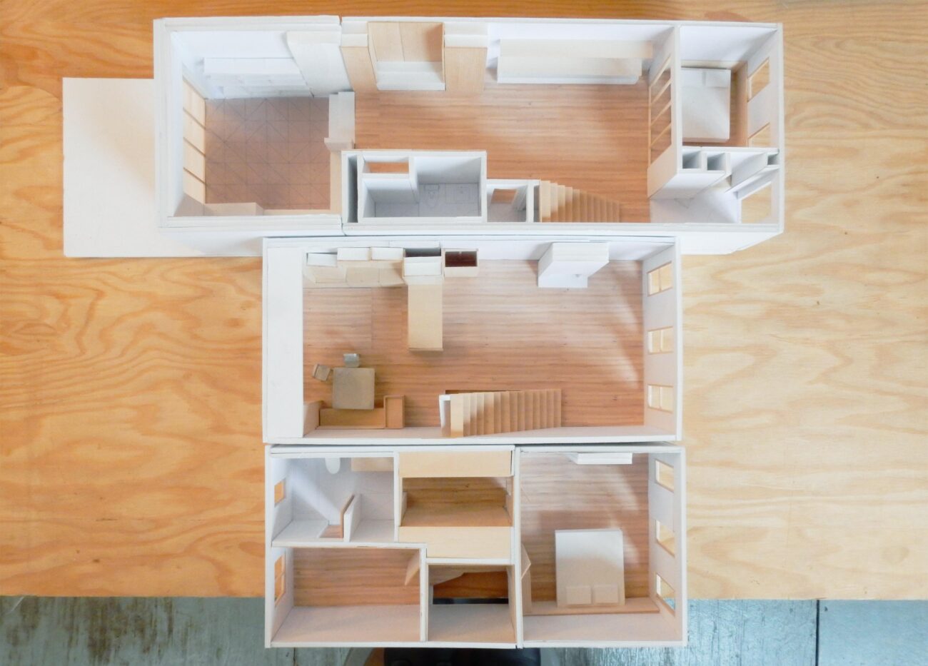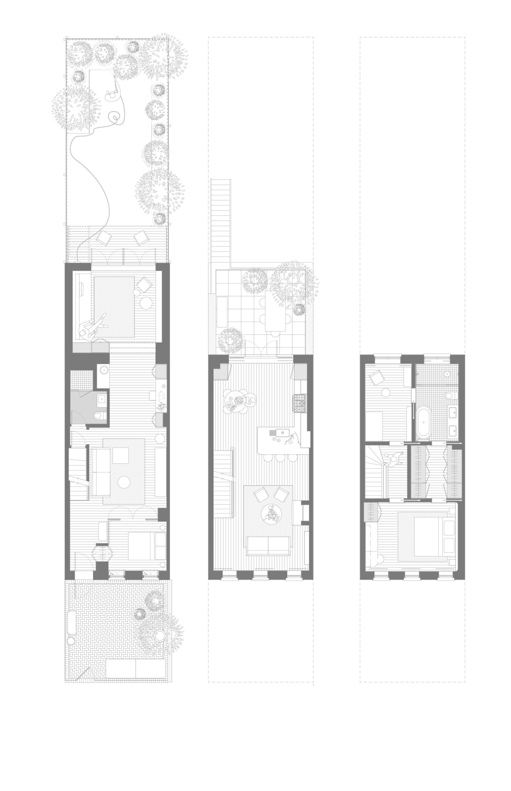 FTA’s gut renovation and addition of a 2,700-square-foot Boerum Hill brownstone, originally built in 1899 and affectionately known as “The Pink House,” for a creative couple with two young children-highlights the building’s rich history by restoring historic detail and preserving aesthetic choices made by its imaginative former owners while simultaneously expanding and refining the space with bright, sumptuous details and smooth, curvaceous surfaces. The interior plan is united by a geometry of soft plaster curves (fireplaces, skylights, hood enclosures, stairs, arched openings), as well as a consistent color palette of pale pink and dark green, and a material palette of aged brass, leather and white oak.